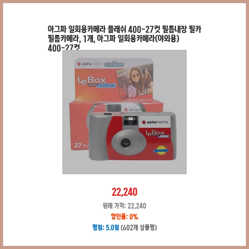 아그파 일회용카메라 플래쉬 400-27컷 필름내장 필카 필름카메라, 1개, 아그파 일회용카메라(야외용) 400-27컷