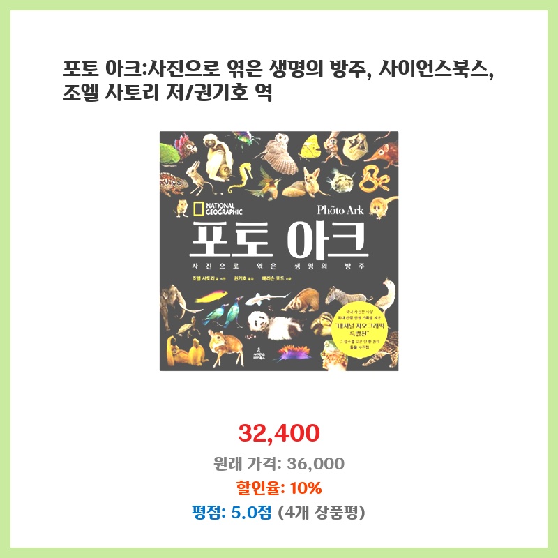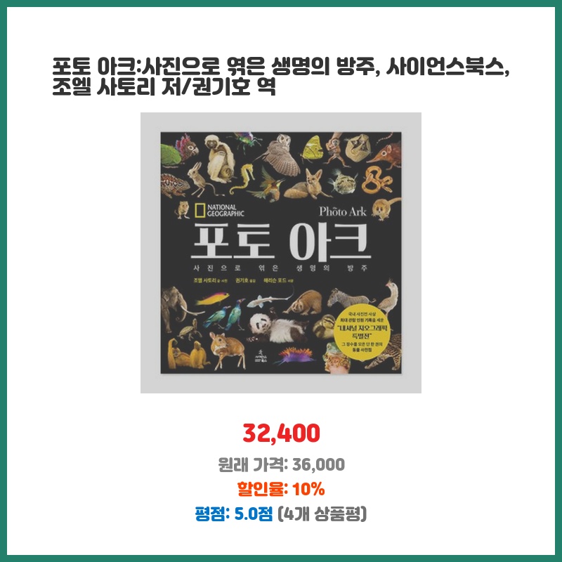 동물 사진에 열정적인 저자의 놀라운 작품집인 포토 아크를 구매했습니다. 뛰어난 기술과 환경 보호에 대한 깊은 열의가 담긴 사진은 동물계의 다양성과 취약성을 생생하게 보여줍니다. 이 책은 동물 사진 애호가와 자연 보호주의자에게 필수적인 작품으로, 동물에 대한 인식을 높이고 보호 노력에 기여할 것입니다.