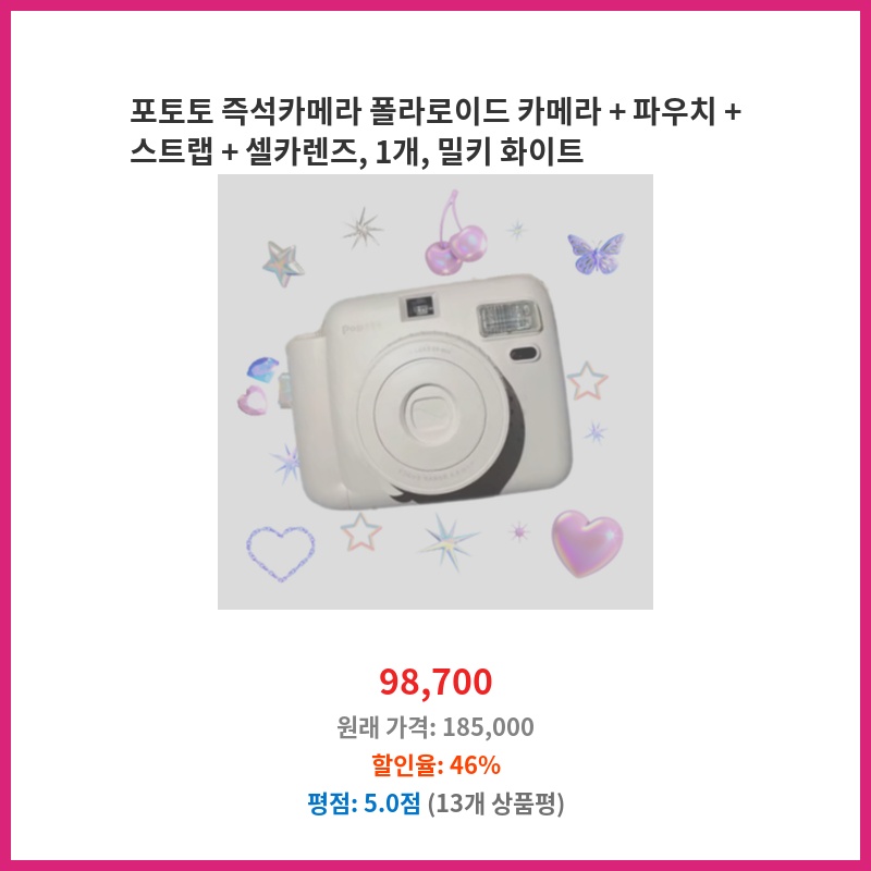 이 포토토 카메라는 멋진 즉석 사진을 찍는 데 완벽합니다. 파우치와 스트랩 덕분에 휴대도 편리하고, 셀카렌즈는 완벽한 셀카를 위해 필수적입니다. 밀키 화이트 색상은 매우 세련되고, 사진 품질도 훌륭합니다.